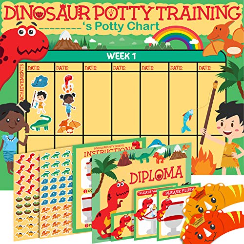 🌈 FUN: our potty training chart set comes with playful stickers designed as various dinosaurs, a caveman, and a volcano, with a durable weekly progress potty chart to stick them to.